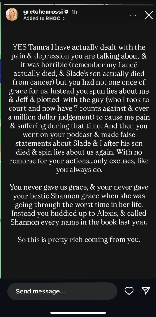 Kështu që, ajo vazhdoi ta thërriste Tamrën jashtë, duke u dashuruar, “Ju nuk kishit një të tillë [ounce] e hirit për ne. Në vend të kësaj, ju rrotulloni gënjeshtra për mua [and] I paaftë [and] komplotuar me djalin (të cilin e çova në gjyq dhe tani kam [seven] numëron kundër [and] mbi një gjykim prej një milion dollarësh) për të më shkaktuar dhimbje [and] duke vuajtur gjatë asaj kohe. Dhe pastaj ju shkuat në podcast -in tuaj [and] bëri deklarata të rreme rreth Slade [and me] Pasi djali i tij vdiq [and] [spun] Shtrihet përsëri për ne. Pa pendim për veprimet tuaja. Vetëm justifikime, si ju gjithmonë, ”përfundoi Gretchen.